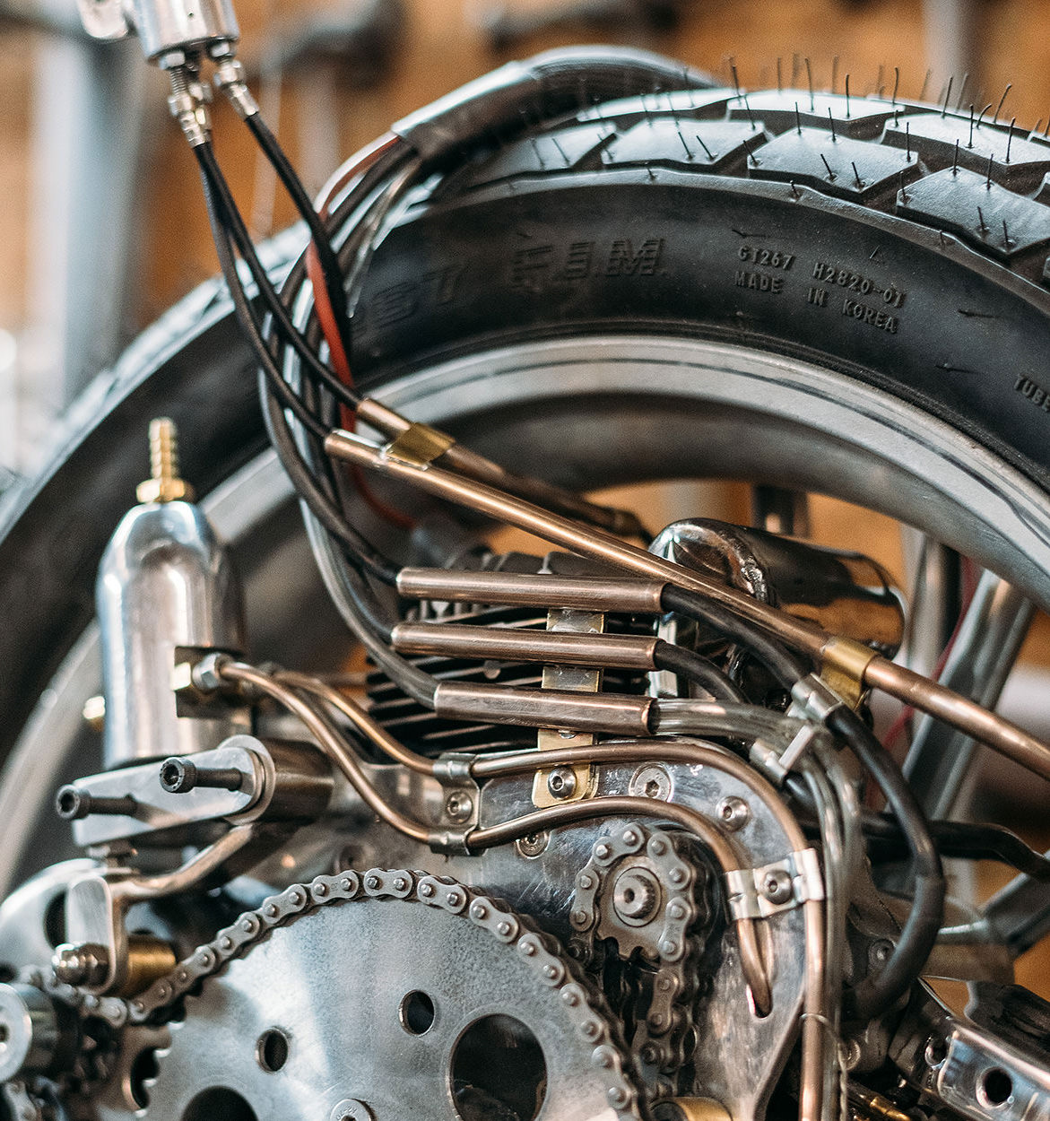 Craig még az alumínium ülés apró lengéscsillapítóját is maga gyártotta. Az egyéb részletek is finoman ki vannak dolgozva, mint például a tanksapka és a gyújtáskapcsoló.