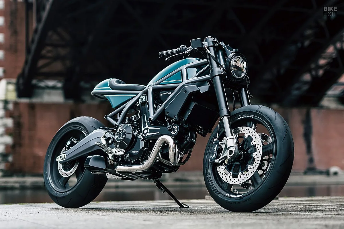 Ez a Wedge Motorcycle által készített egyedi Ducati Scrambler 1100 jól mutatja, hogy mi lehetett volna ez a jármű. A váztól elragadtatva, a Wedge alapítója, Takashi Nihira úgy döntött, hogy ezt teszi a tervezés középpontjába. Új üzemanyagtartályt és két oldalsó burkolatot tervezett, amelyek együttesen úgy tűnnek, mintha a tartályt a rácsos vázba szorították volna. A hátsó részt egy café racer stílusú hátsó lökhárító díszíti, amely egy módosított, aszimmetrikus elrendezésű alvázon helyezkedik el, amely helyet biztosít a Ducati eltolt hátsó lengéscsillapítójának. A gazdag türkizkék festés kiemeli a Ducati elegáns esztétikáját, míg a Rotobox karbonkerekek és az alacsony üléspozíció sportos kiállást biztosít.